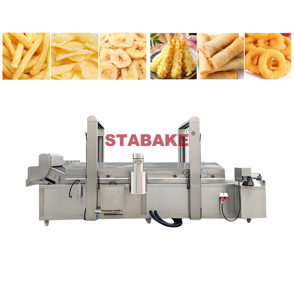 The continuous fryer machine is suitable for frying meat, seafood, vegetables, and pasta products. The equipment uses electricity, oil, or gas as heating energy. The entire machine is constructed of thicken SUS304 stainless steel and consists of an automatic/manual lifting system, a unique product conveying system, a slag removal system, a heating system, an oil circulation system, a smoke extraction system, and an electrical control system | ||